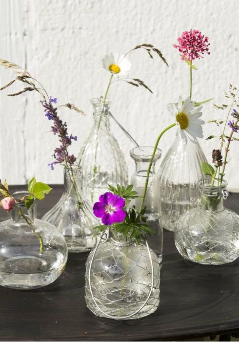 Полевые цветы здорово освежают пространство и вносят в него нотки деревенского шика. Они являются самыми недорогими, но и в то же время, стильными декоративными элементами. Их можно ставить даже в обычные стеклянные банки, даже в таких сосудах они будут смотреться прекрасно.